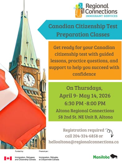 The citizenship preparation classes run Thursday evenings from April 9 to May 14, from 6:30 to 8:00 p.m., at the Regional Connections Altona office.