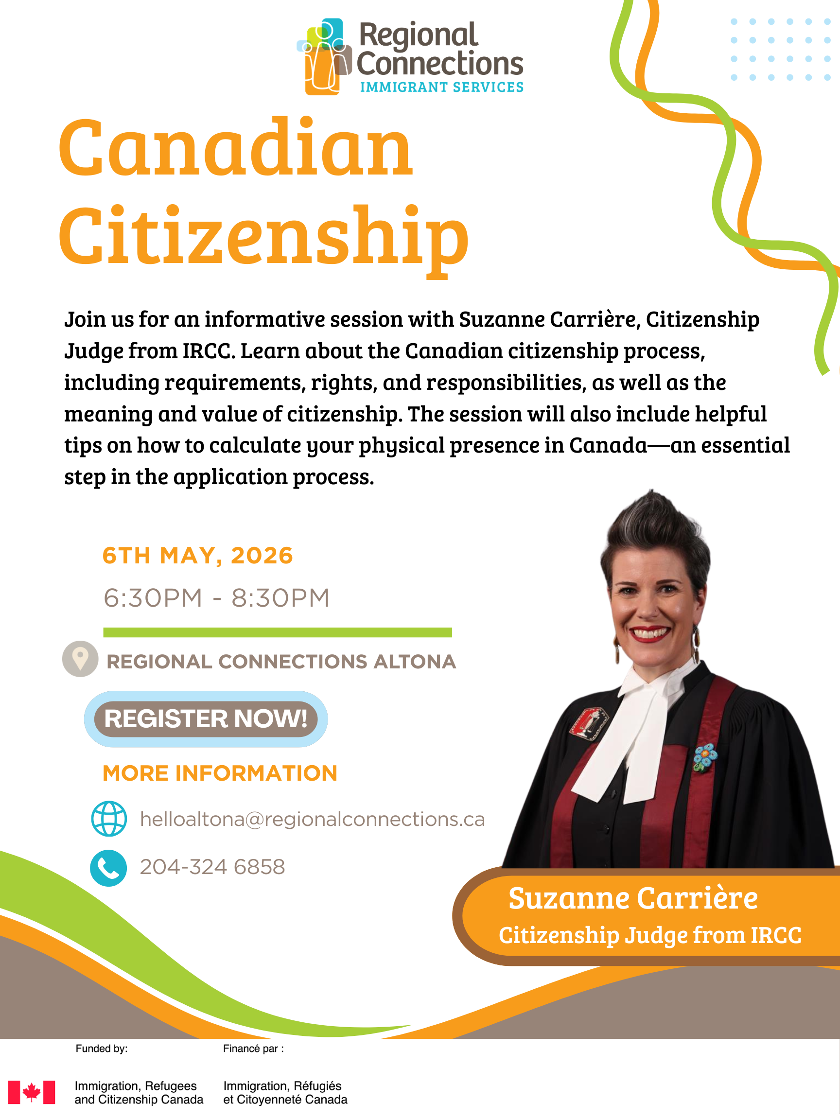 Join us for an informative session with Suzanne Carrière, Citizenship Judge from IRCC. Learn about the Canadian citizenship process, including requirements, rights, and responsibilities, as well as the meaning and value of citizenship. The session will also include helpful tips on how to calculate your physical presence in Canada—an essential step in the application process.