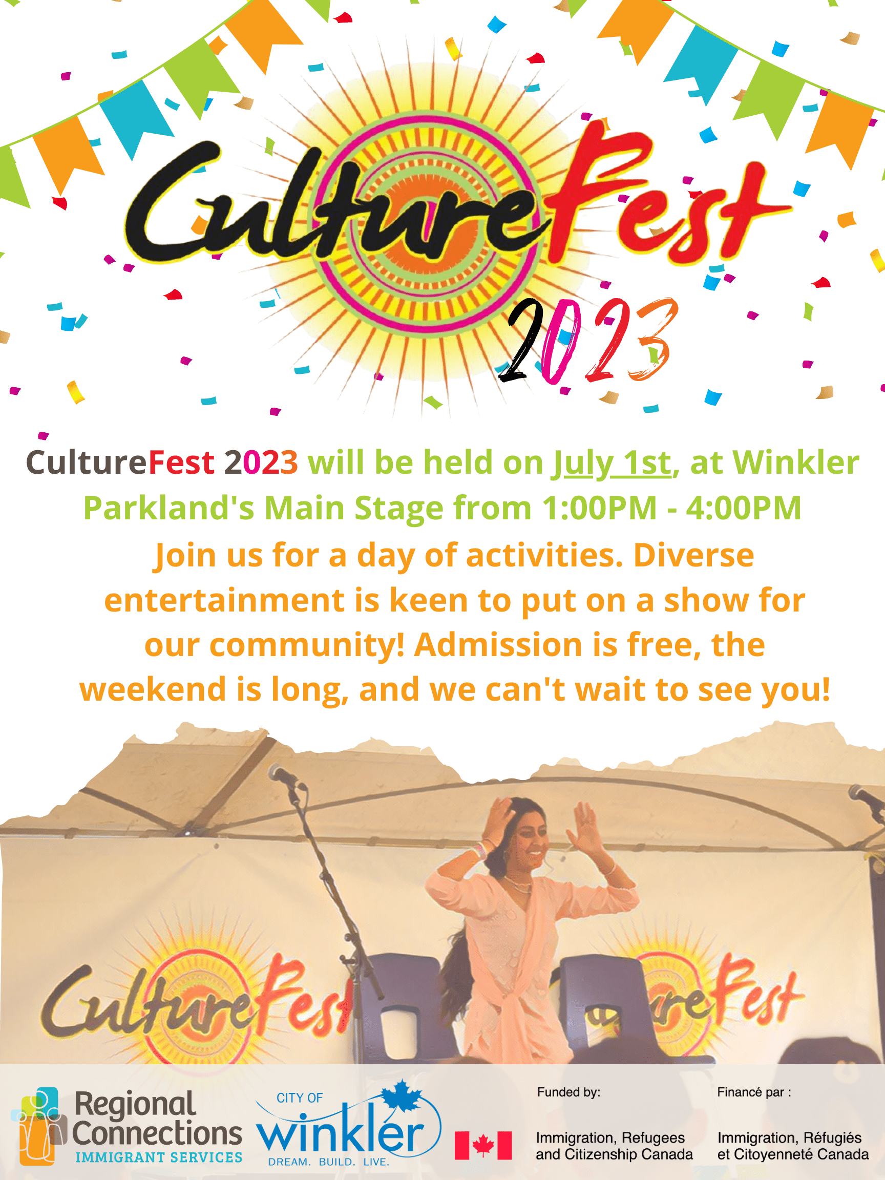 CultureFest 2023 is ready when you are! Come out and join us on July 1st at Winkler’s Parkland Main Stage for a day of activities. Diverse entertainment is keen to put on a show for our community! Admission is free, the weekend is long, and we can’t wait to see you!