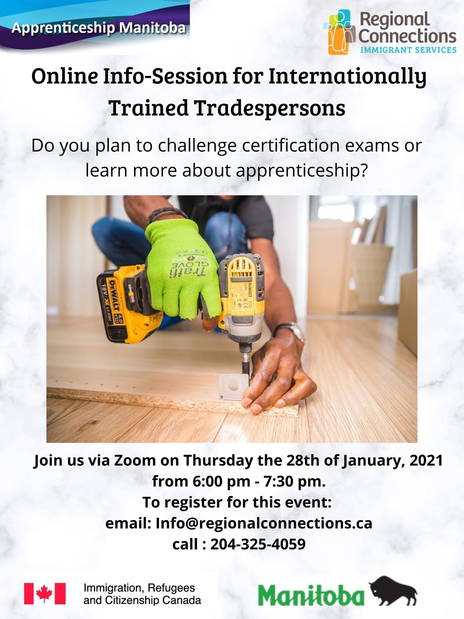 If you are an Internationally trained tradesperson, and you would like to be certified in Manitoba, join us at our virtual info session on January 28th, 2021, and hear from Apprenticeship Manitoba.