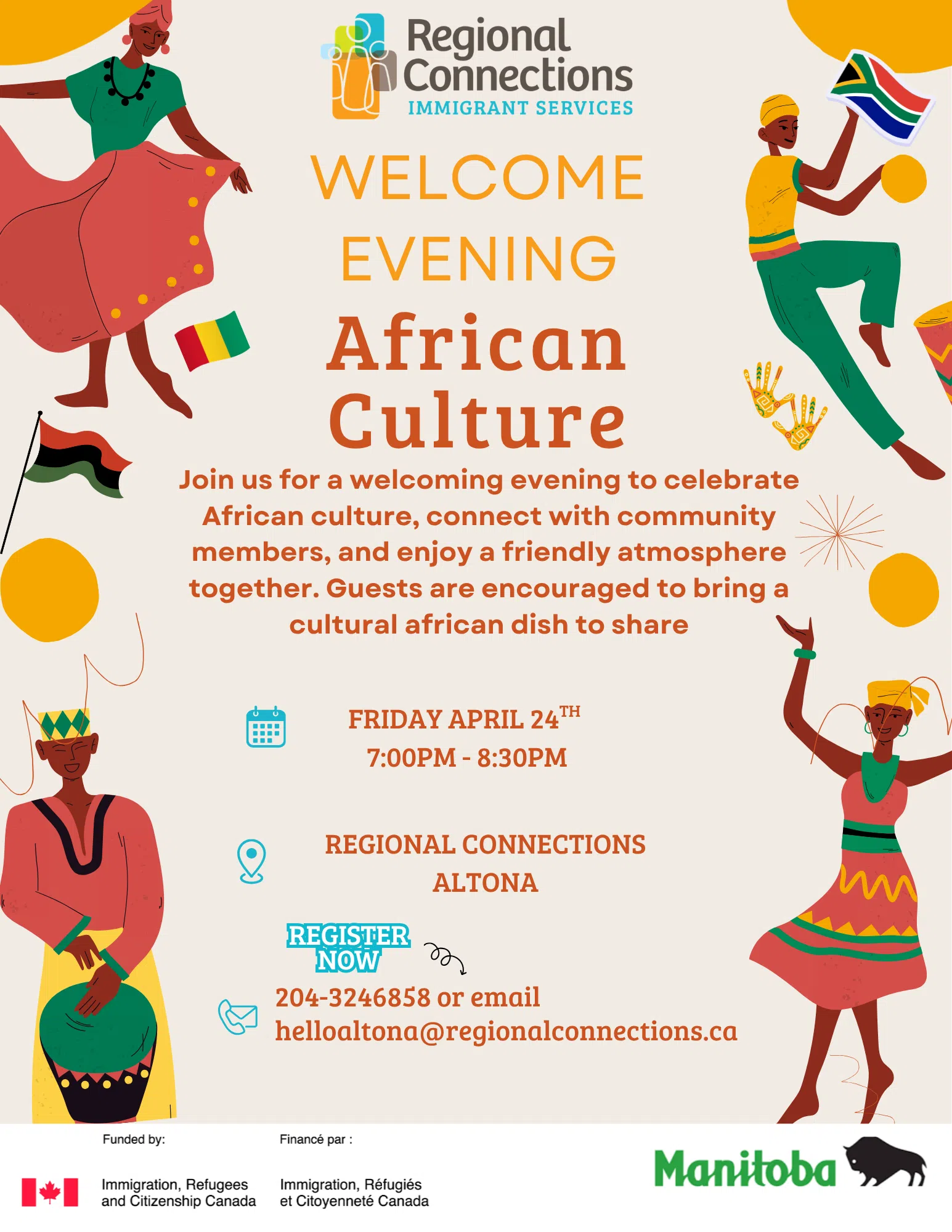 Join us for a welcoming evening to celebrate African culture, connect with community members, and enjoy a friendly atmosphere together. Guests are encouraged to bring a cultural african dish to share