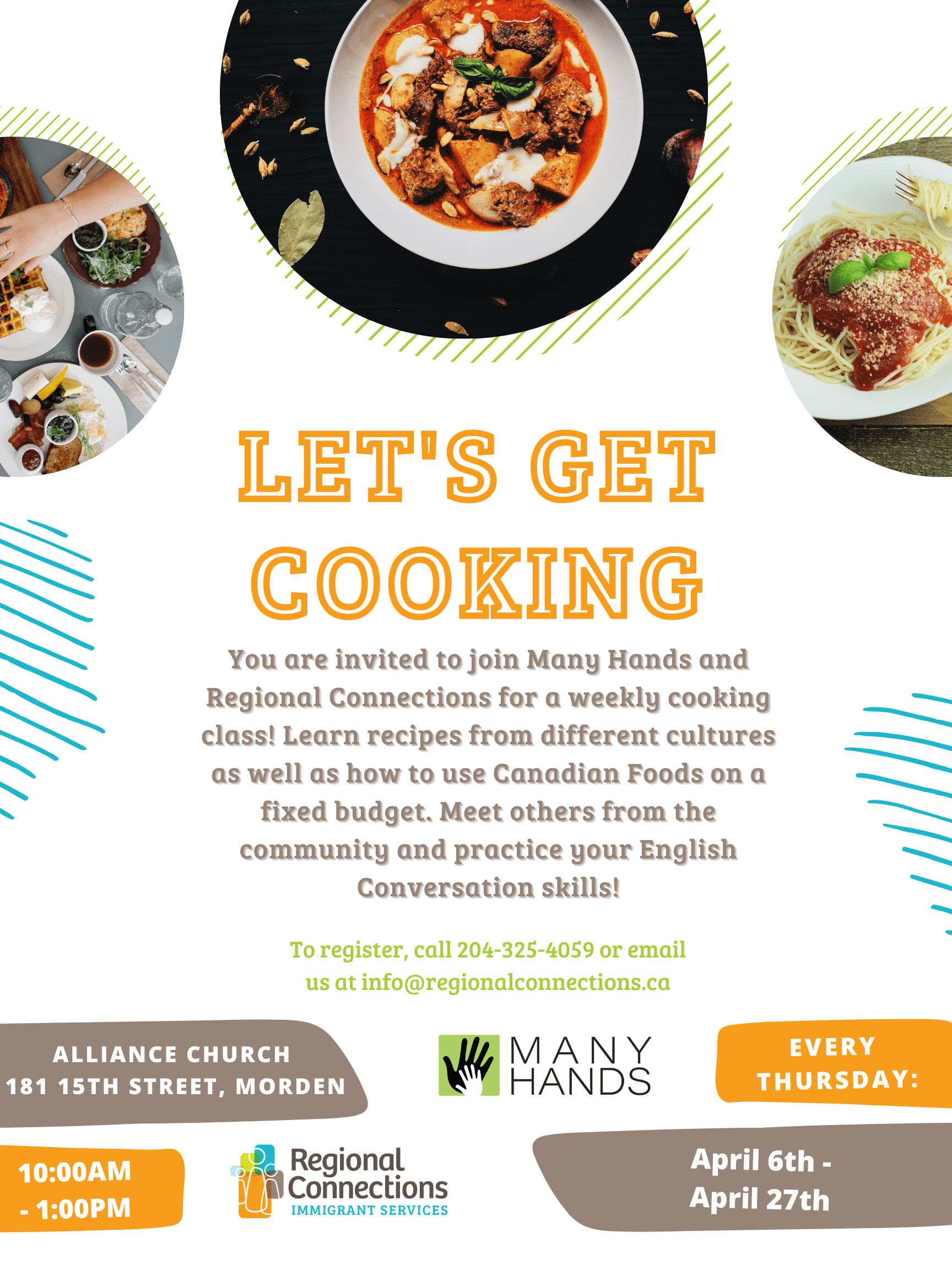 You are invited to join Many Hands in Morden and Regional Connections for a weekly cooking class! Learn recipes from different cultures as well as how to use Canadian Foods on a fixed budget. Meet others from the community and practice your English Conversation skills!