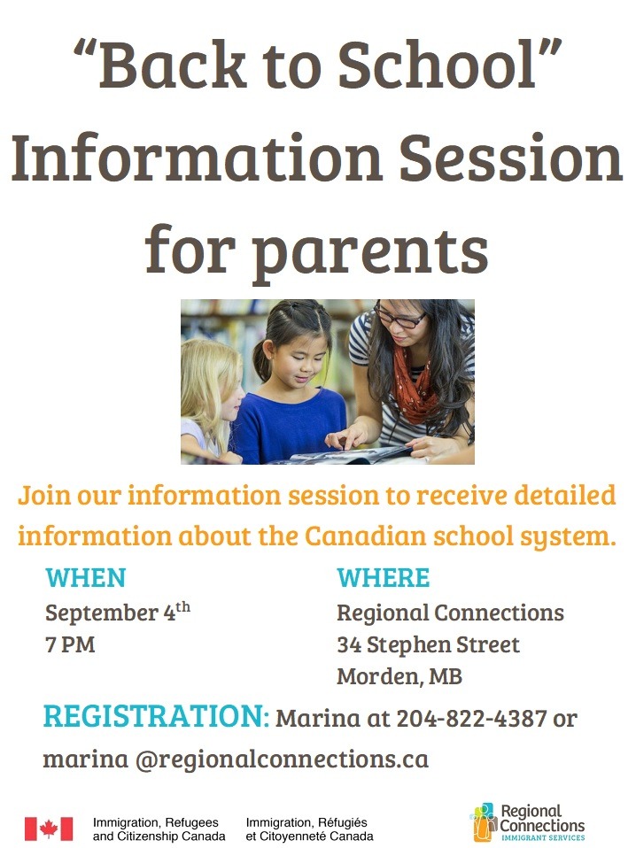 “Back to School” Information Session for parents – Morden September 4, 2018 @ 7:00 pm - 9:00 pm Join us to receive detailed information about the Canadian School System.
