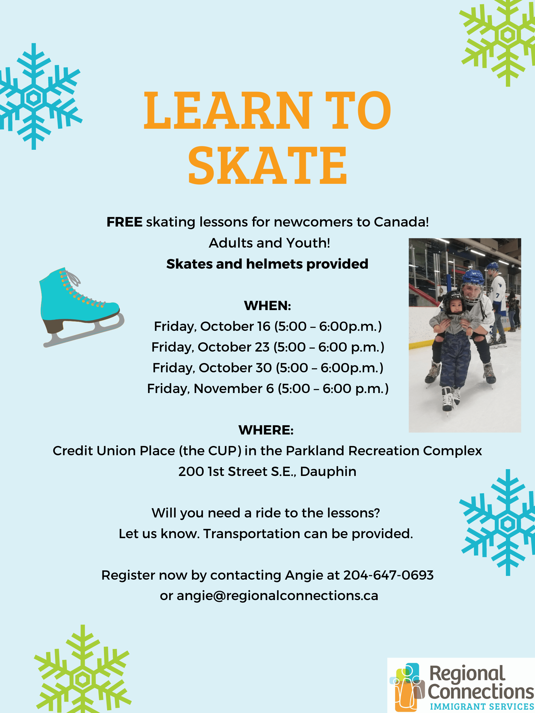 Parkland Recreation Complex 200 1st Street S.E, DauphinFREE skating lessons for newcomers to Canada! Adults and Youth Skates and helmets provided