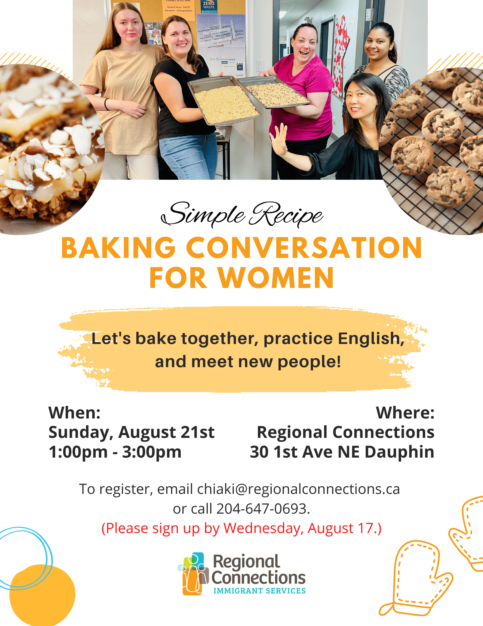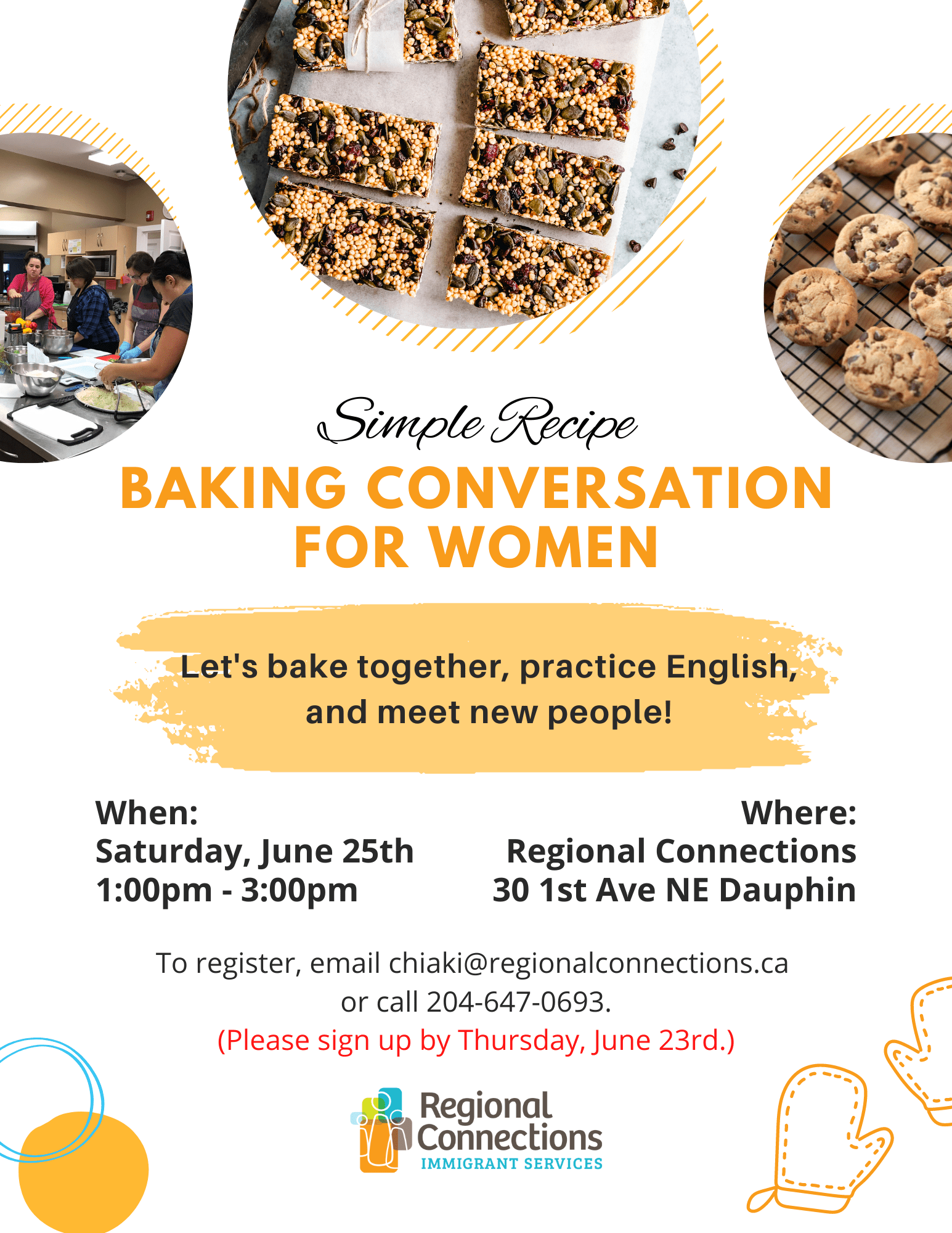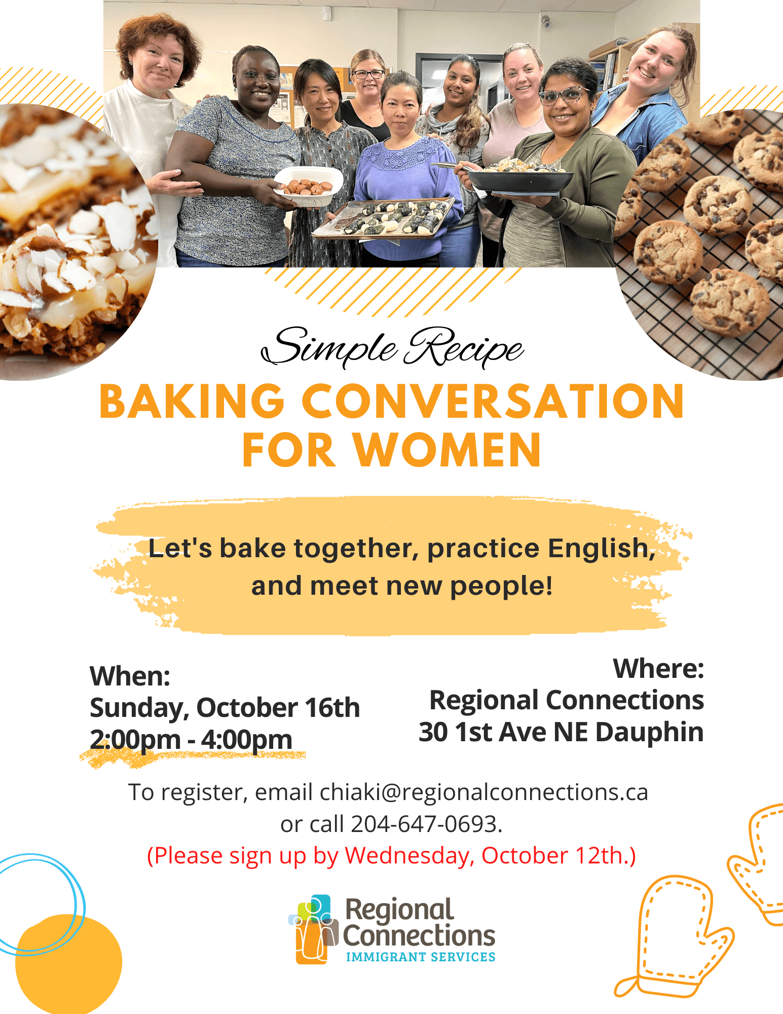 Baking Conversation for Women October 16, 2022 @ 2:00 pm - 4:00 pm Regional Connections Dauphin 30 1st Avenue NE, Dauphin, Manitoba, Canada Join us in Dauphin for an evening of baking, practicing our conversation skills and meeting new people!