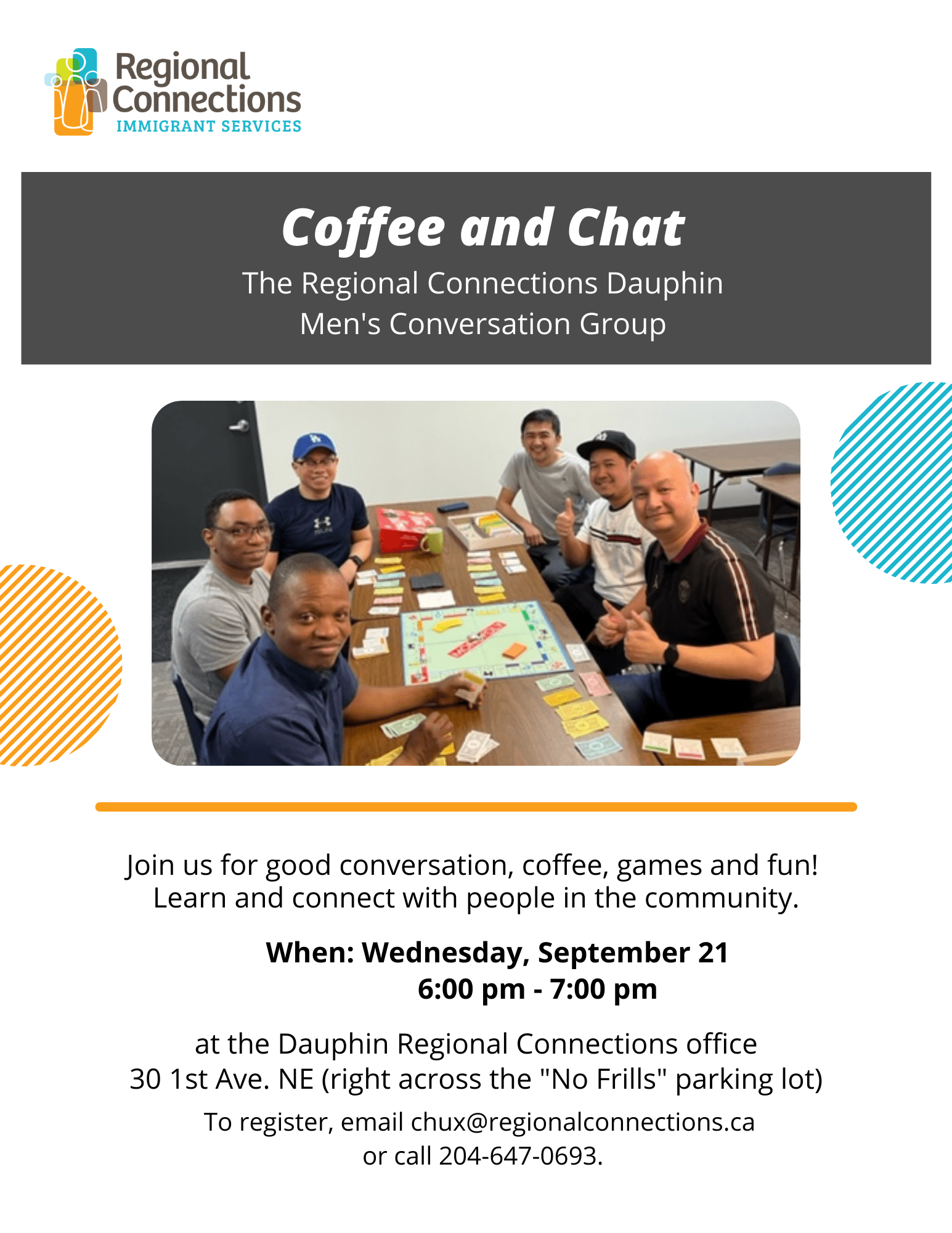 Coffee and Chat September 21, 2022 @ 6:00 pm - 7:00 pm Regional Connections Dauphin 30 1st Avenue NE, Dauphin, Manitoba, Canada