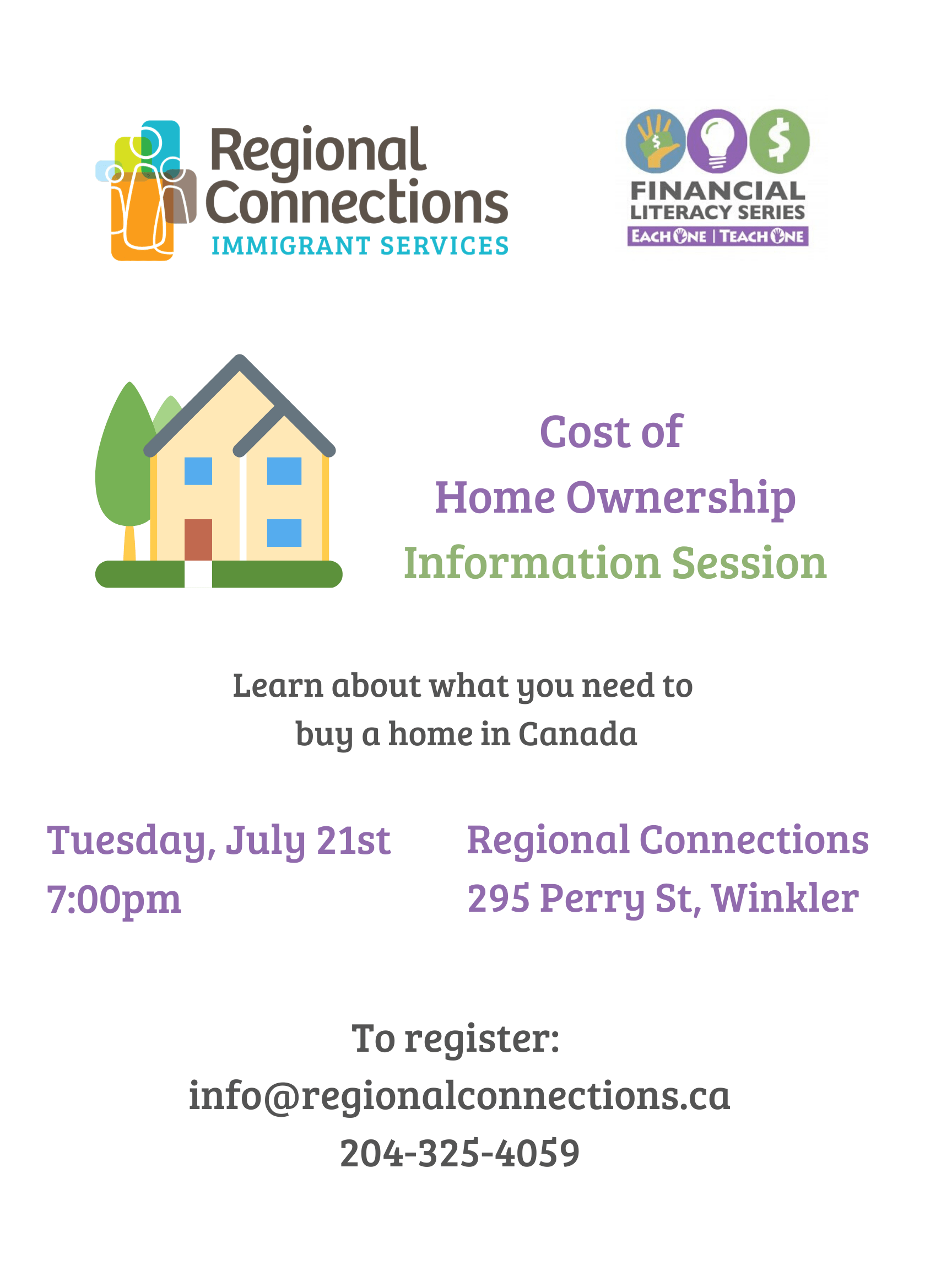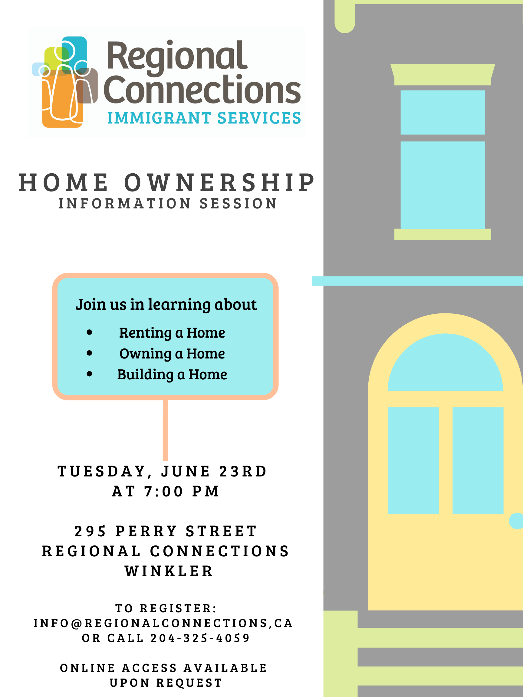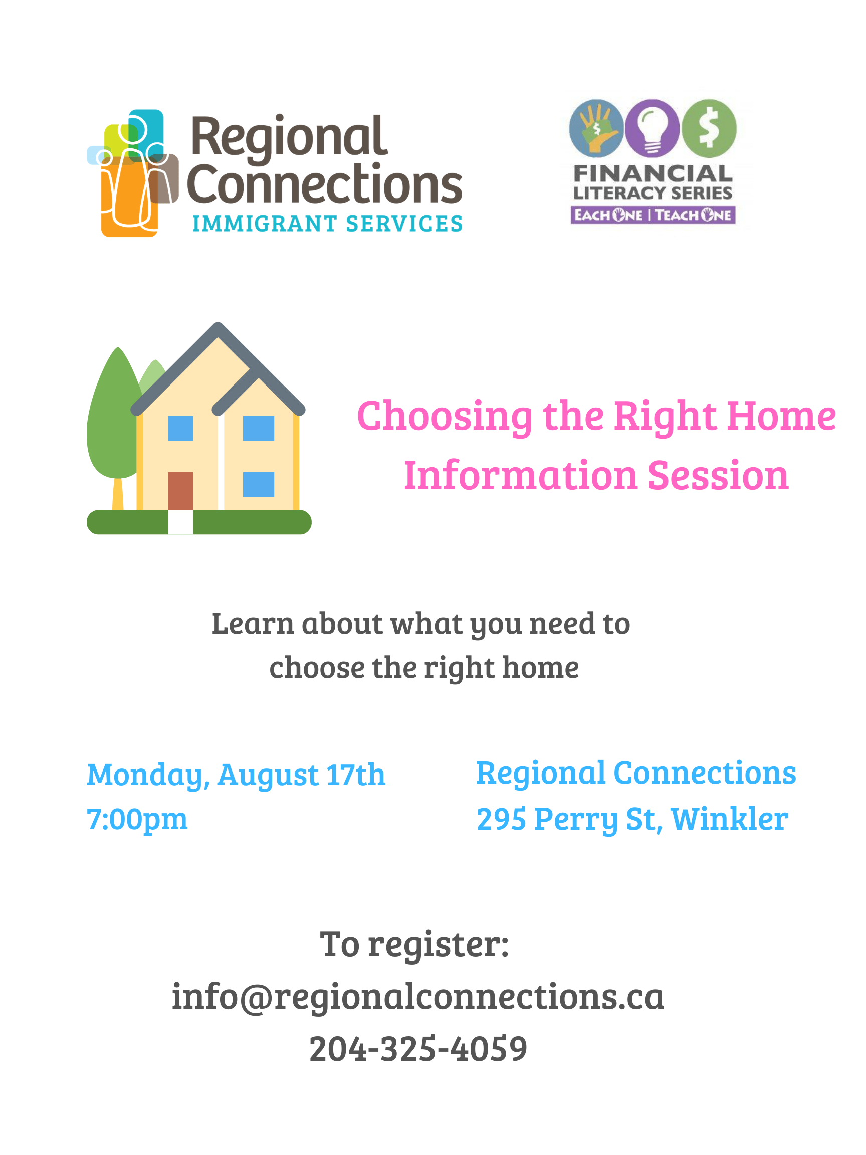 Regional Connections, Winkler 2-295 Perry St, Winkler, Manitoba, CanadaLooking for the right home for you? The Home Ownership Info session will give you details about: Renting a Home Owning a Home Building a Home Don't miss the opportunity to learn about this. To Register: email us at [email protected] or call us at 204-325-4059 *online access available upon request