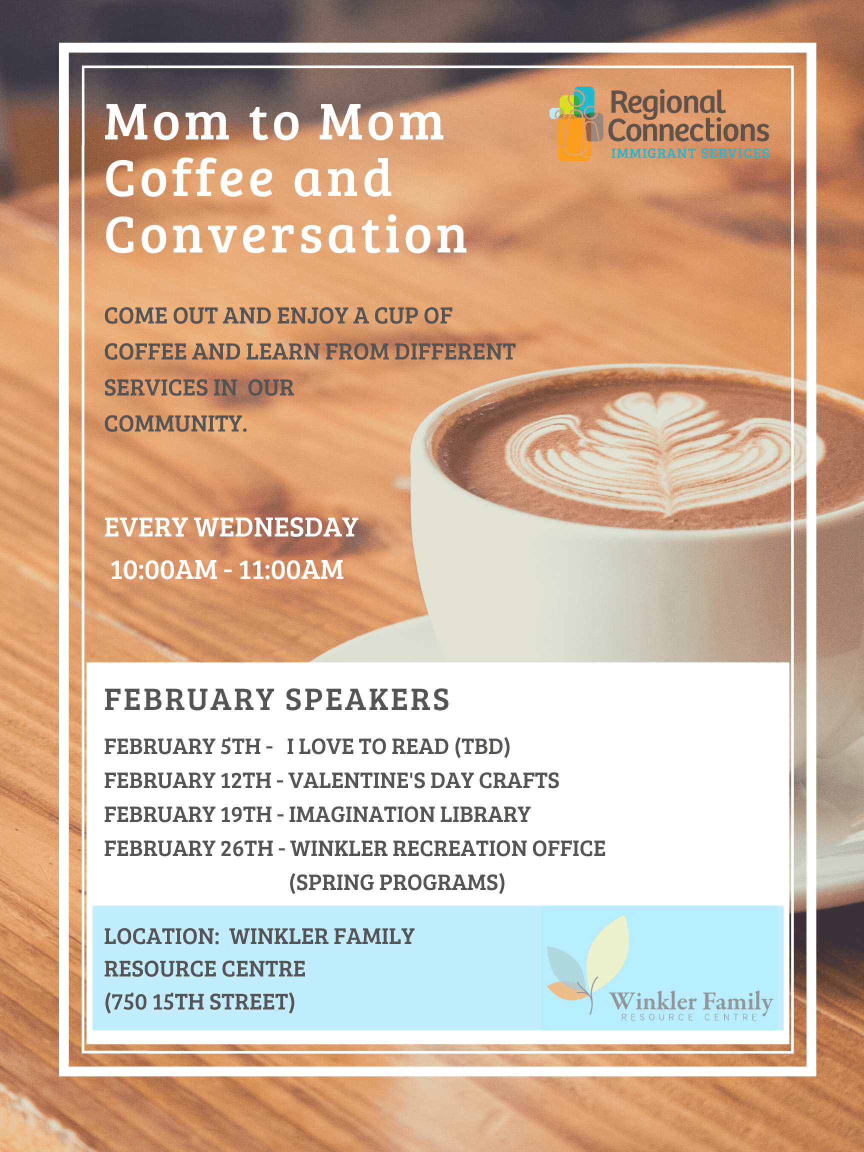 Winkler Family Resource Centre 545 Industrial Dr, Winkler, Manitoba, CanadaCome and enjoy a cup of coffee and learn from different services in our community. Childcare provided.
